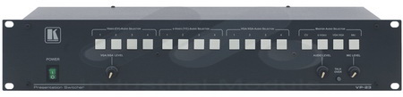 VP-23 - устройство совмещающее в себе функции коммутатора 4:1 сигналов композитного видео и аудио стереосигналов, коммутатора 4:1 S-video и сигналов аудио, а также коммутатора 4:1 VGA в сочетании с сигналом аудио. Каждая секция модуля может управляться независимо от остальных. Управление осуществляется при помощи кнопок на передней панели и по интерфейсу RS-232. Дополнительная секция коммутации аудио переключает один из заранее выбранных аудиовходов с других секций коммутации на отдельный выход. Она позволяет добавить дополнительный микрофонный канал посредством коммутации, микширования или наложения аудио. На передней панели расположены регуляторы уровня выходного сигнала VGA, сигнала аудио и сигнала микрофона, а также - контроля АЧХ.